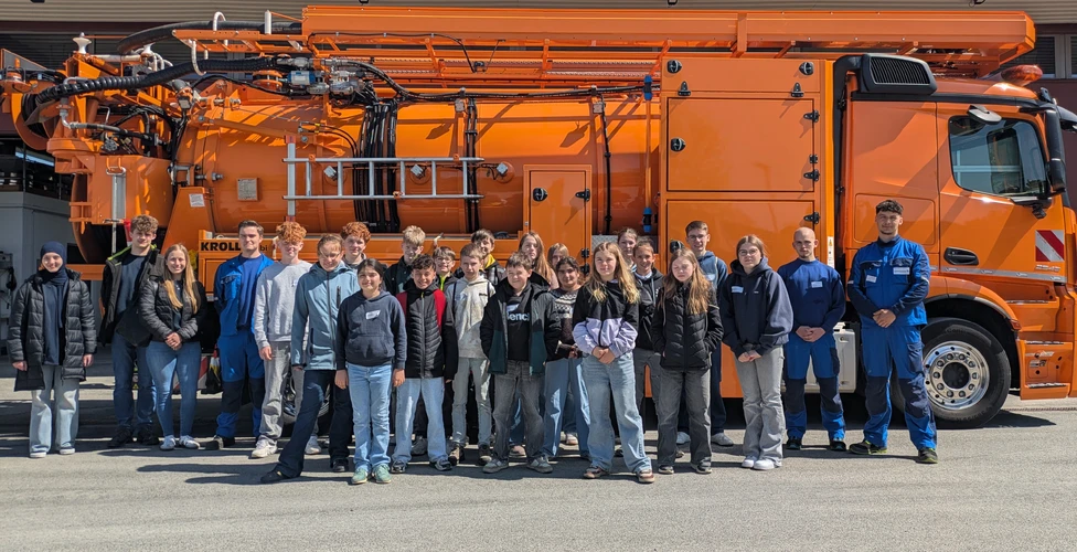 Auf der Kläranlage der Stadtentwässerung wurde anschließend anschaulich erläutert, welche Schritte notwendig sind, um aus verschmutztem Wasser wieder sauberes zu gewinnen. Dieser Prozess findet tagtäglich im Verborgenen statt, ist aber unverzichtbar für Verbraucherinnen, Verbraucher und Umwelt. Großen Eindruck hinterließ auch der Spülwagen, mit dessen Technik das Abwassernetz gereinigt wird. Einmal "Chef" im Fahrerhaus zu sein, war ein echtes Highlight.
